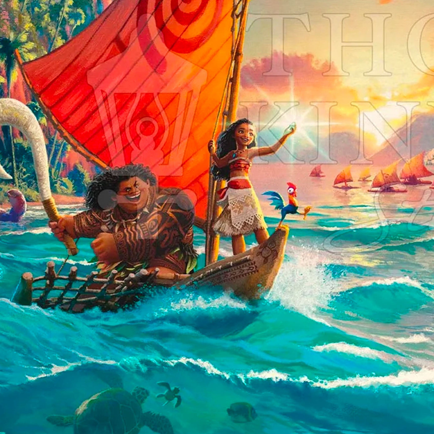 Honor the journey of Moana on her quest to save her island Motunui with this art print by Thomas Kinkade Studios! Moana, Hei-Hei, and the demigod Maui sail forth while Te Fiti looks on. In the water, you can see the crab Tamatoa, Pua on the beach, and what appears to be Crush and his son Squirt floating in the water below.