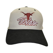 🤩 Show off with style! Features the Texas Longhorns alternate logo prominently displayed on a cream and black two-tone cap. The logo is crafted from vibrant red and white thread for eye-catching contrast.