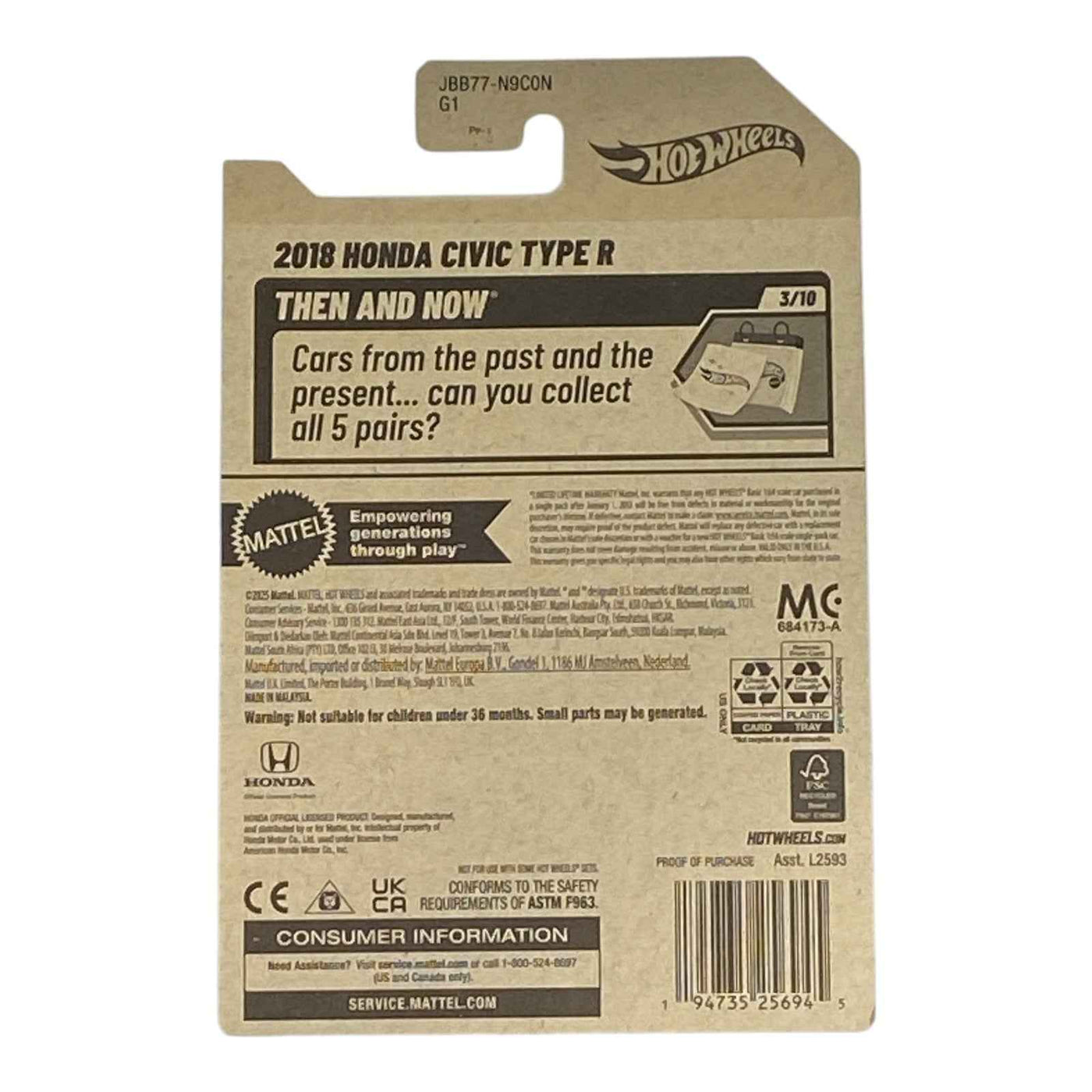 Ignite your JDM passion with the blue Hot Wheels 2018 Honda Civic Type R from Then and Now Series 3/10 (2025 #HNW32), a turbocharged 1:64 scale masterpiece that fuses modern street-racing aggression with Hot Wheels legacy! This Aegean Blue stunner boasts red Brembo brakes, black aero kit, rear wing tampo, and chrome 10-spoke wheels—perfectly replicating the FK8 legend. Ideal for track battles, display cases, or completing your Then and Now set, this Walmart short-card gem delivers blistering performance and collector-grade detail. Dominate searches for blue Civic Type R Hot Wheels and own the road!