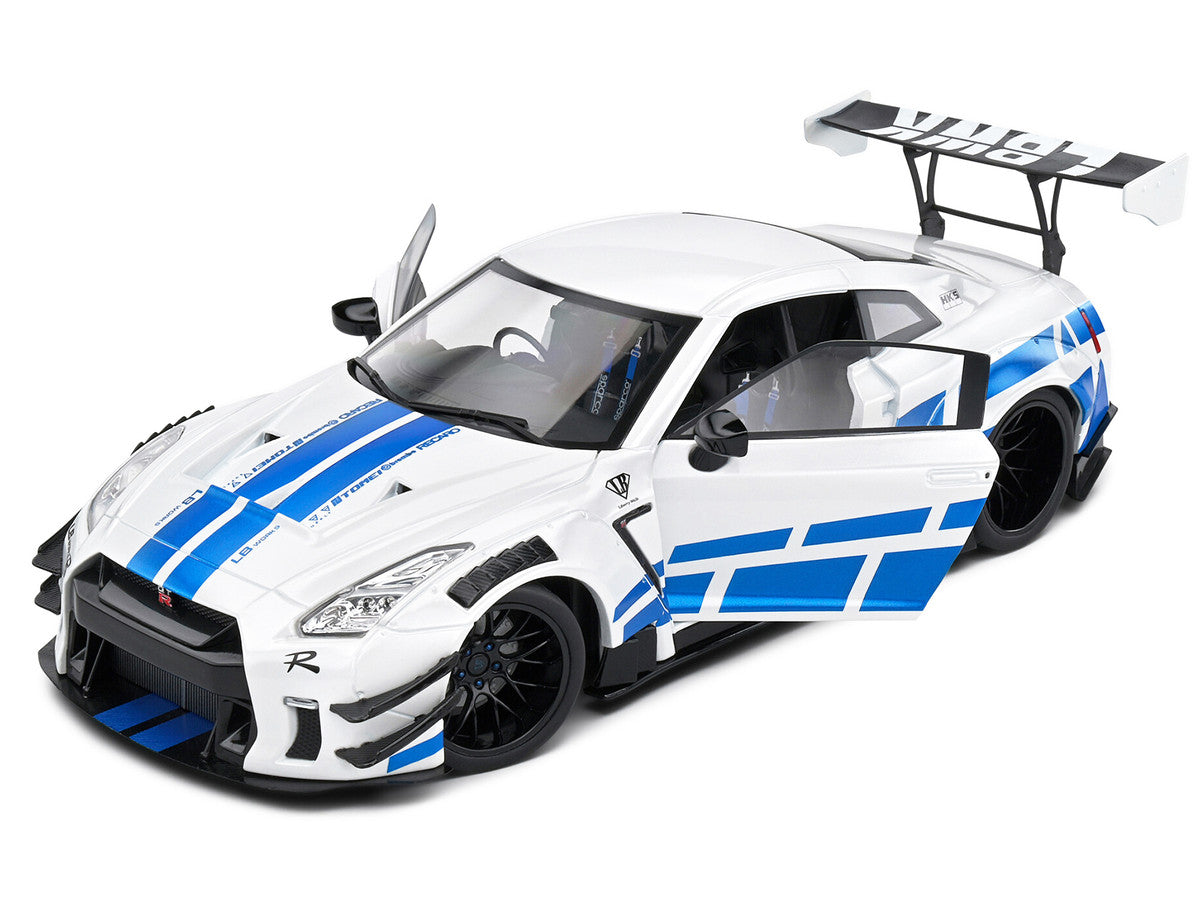 Nissan 2024 GT-R (R35) RHD (Right Hand Drive) with Liberty Walk 2.0 Body Kit White Metallic with Blue Stripes "For Paul Tribute" 1/18 Diecast Model Car by Solido