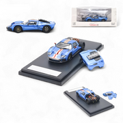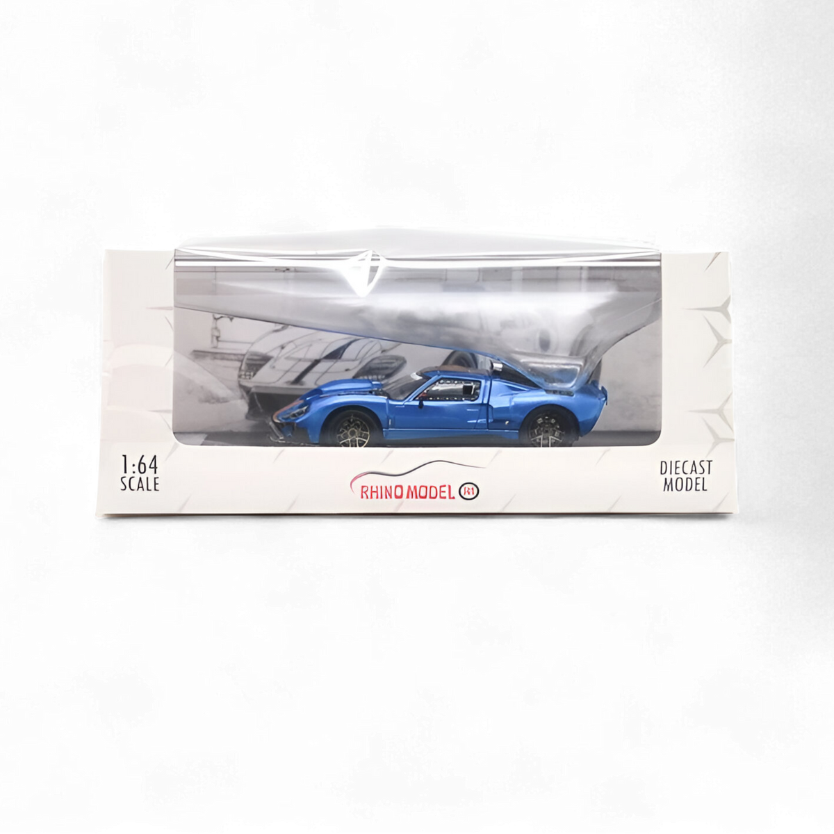 Rhino Model Ford GT40 1/64 Scale Diecast Model in Blue This collectible diecast features a magnetic hood structure and is limited to 999 units. It offers detailed craftsmanship and is perfect for collectors.