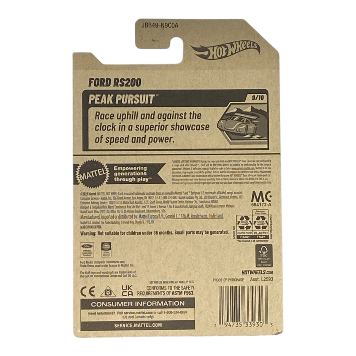 Unleash rally-bred fury with the Hot Wheels Ford RS200 from the adrenaline-charged Peak Pursuit Series 9/10! This 1:64 scale die-cast legend, a 2025 mainline standout (#184/250), revives the iconic 1980s Group B monster with a striking white body, bold red-blue racing livery, and aggressive wide-body aero that screams mountain-conquering speed. Powered by a fictional mid-engine turbo setup and fitted with off-road-ready OR6SP wheels, tinted windows, and a black plastic base, it’s engineered for epic drifts, jumps, and high-altitude battles. Perfect for kids 3+ and adult collectors, this Ford RS200 delivers authentic play value on orange tracks or pride of place in display cases. Search “Hot Wheels Ford RS200 2025” or “Peak Pursuit rally diecast” to own this must-have mini that transforms every corner into a WRC victory stage!