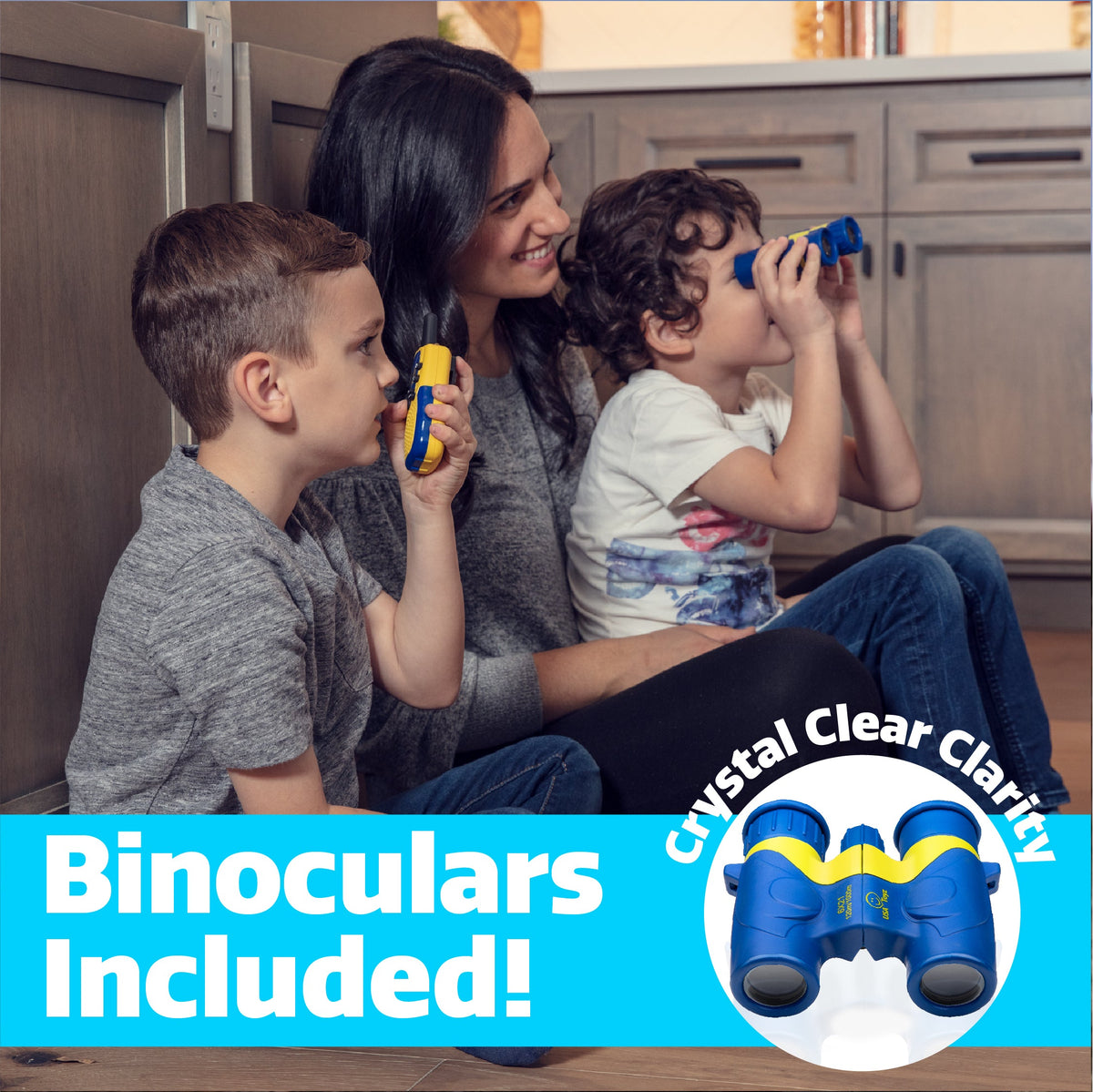 KIDS WALKIE TALKIES OUTDOOR KIT: These easy-to-use indoor / outdoor toys for kids include 2 walkie talkies with backlit LCD screens and 1 pair of kids binoculars; long range walkie talkie set has a 2 mile range