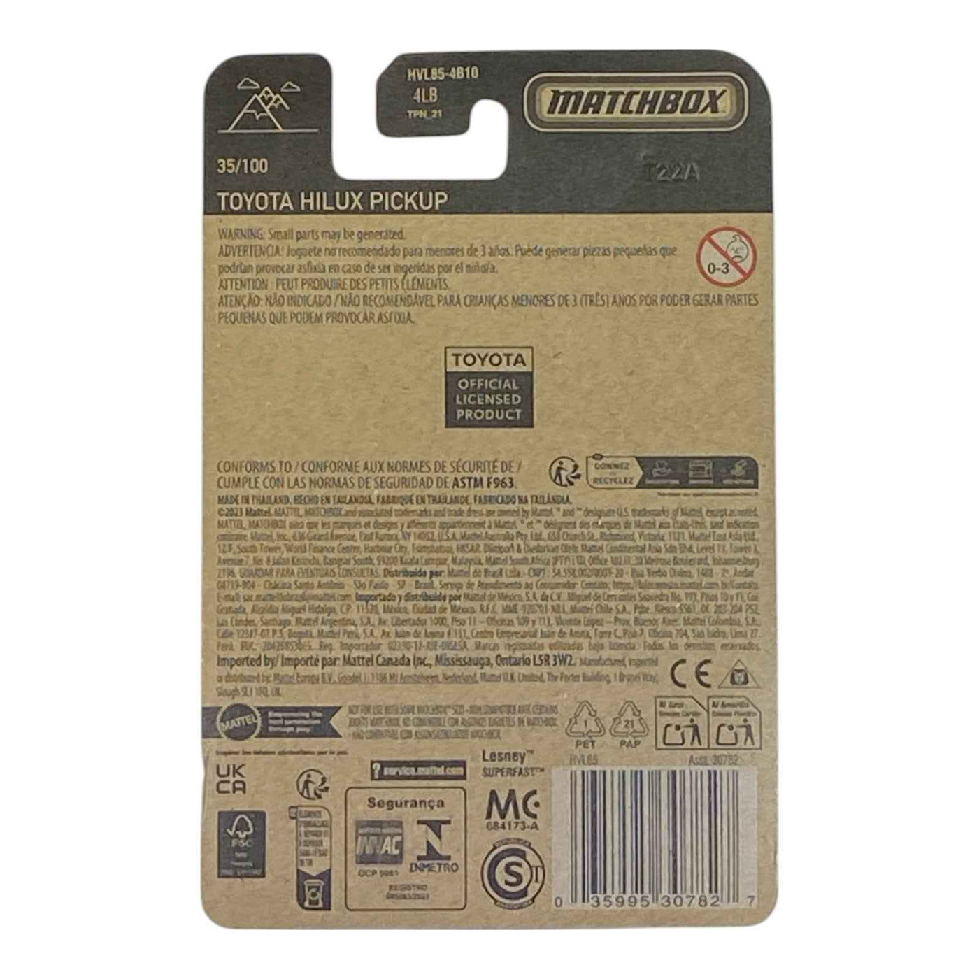 Discover the Matchbox Toyota Hilux Pickup from the Series 35/100 collection, a must-have for die-cast enthusiasts and collectors! This iconic 1:64 scale model captures the rugged charm of the legendary Toyota Hilux, known for its durability and off-road prowess. With authentic detailing, vibrant colors, and sturdy construction, it’s perfect for play or display. Ideal for kids and collectors alike, this Matchbox vehicle brings adventure to life. Add this timeless pickup to your collection today and celebrate the legacy of Matchbox craftsmanship!